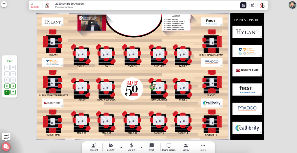 During a year when COVID-19 has changes lives and what it means to gather, an event that is typically done in-person as a large awards gala had to pivot to a virtual environment. After a lot of research and demos, we selected the virtual event platform, Remo, for this event. We worked closely with their development team to customize a floor-plan that would prominently display our sponsor organizations and would be easy to navigate. One of the biggest aspects of our events that we wanted to make sure we could translate virtually was face-to-face networking. This platform allowed us to set up various tables and lounges for attendees to intimately connect via video chat. We interspersed networking breaks throughout the awards presentation and pre-recorded content to reduce technical difficulties day-of. Built into the floor-plan were an SBN Concierge table and Remo Help Desk where attendees could go if they had any questions or technical questions. All attendees were emailed know-before-you-go information, the event link, and a link to a video help guide prior to the event day. A Smart Business team member was on stand-bye as the primary contact if anyone had any trouble accessing the event link.