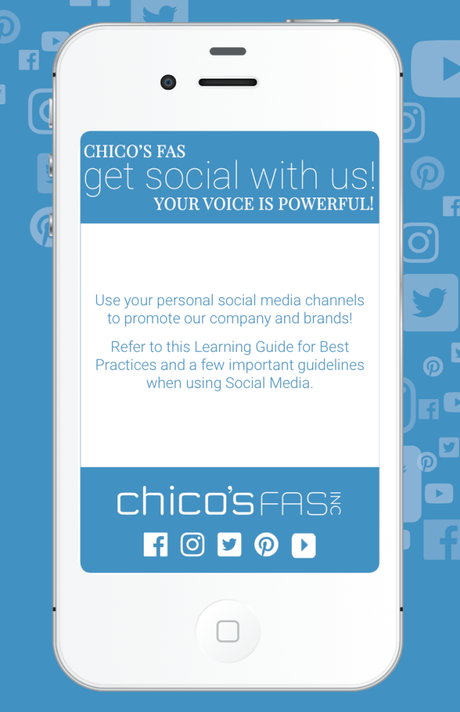 Social Media Policy Guide that I designed during my time at Chico’s FAS. Copies of this guide were sent to every Chico’s, White House Black Market, and Soma store location. Related